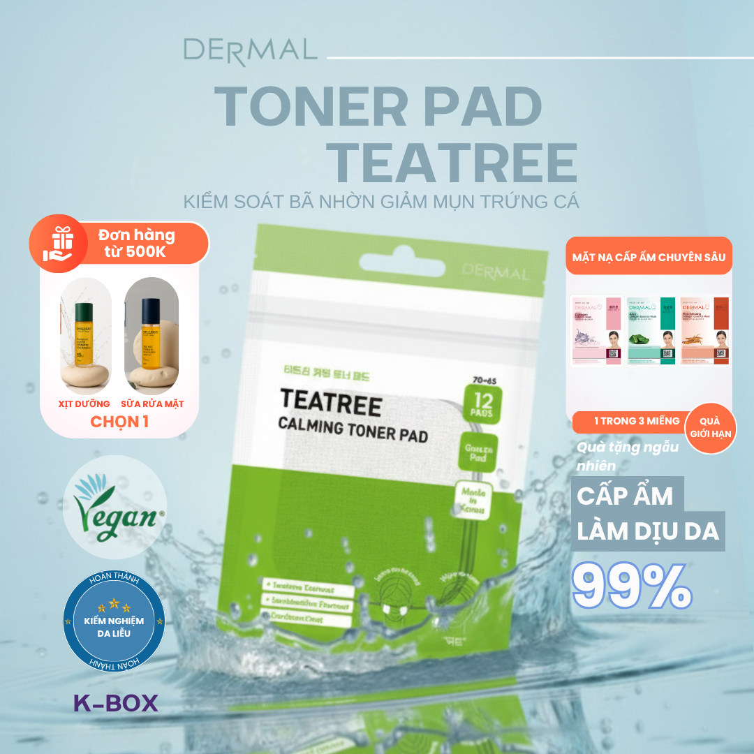 Dermal Teatree Toner Pad giúp chăm sóc da mụn với chiết xuất tràm trà và rau má, giúp kháng khuẩn, làm dịu viêm đỏ và kiểm soát dầu. Thiết kế tiện dụng, sử dụng như bước làm sạch sau rửa mặt hoặc đắp nhanh làm mát da nhạy cảm, da dầu mụn.